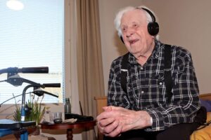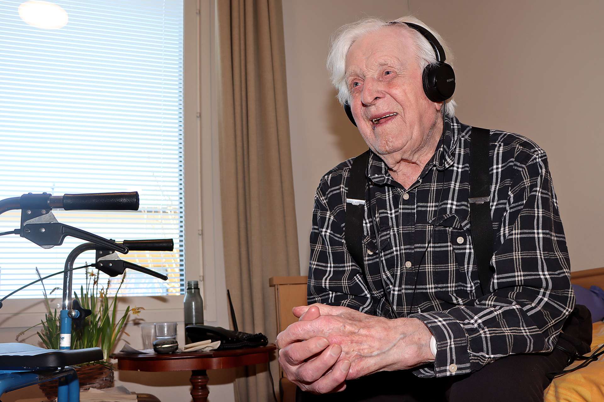 Kurittulasta, pienviljelyspaikasta kotoisin oleva Paavo Grönroos täyttää sata vuotta ensi syksynä. Nyt hän asuu hoivakodissa Hirvikoskella. Kuulokkeet on laitettava korville, sillä veteraanin kuulo on alkanut reistaamaan viime aikoina. Kuva ja teksti Loimaan Lehti 25.4.2026, Lari Kiviranta